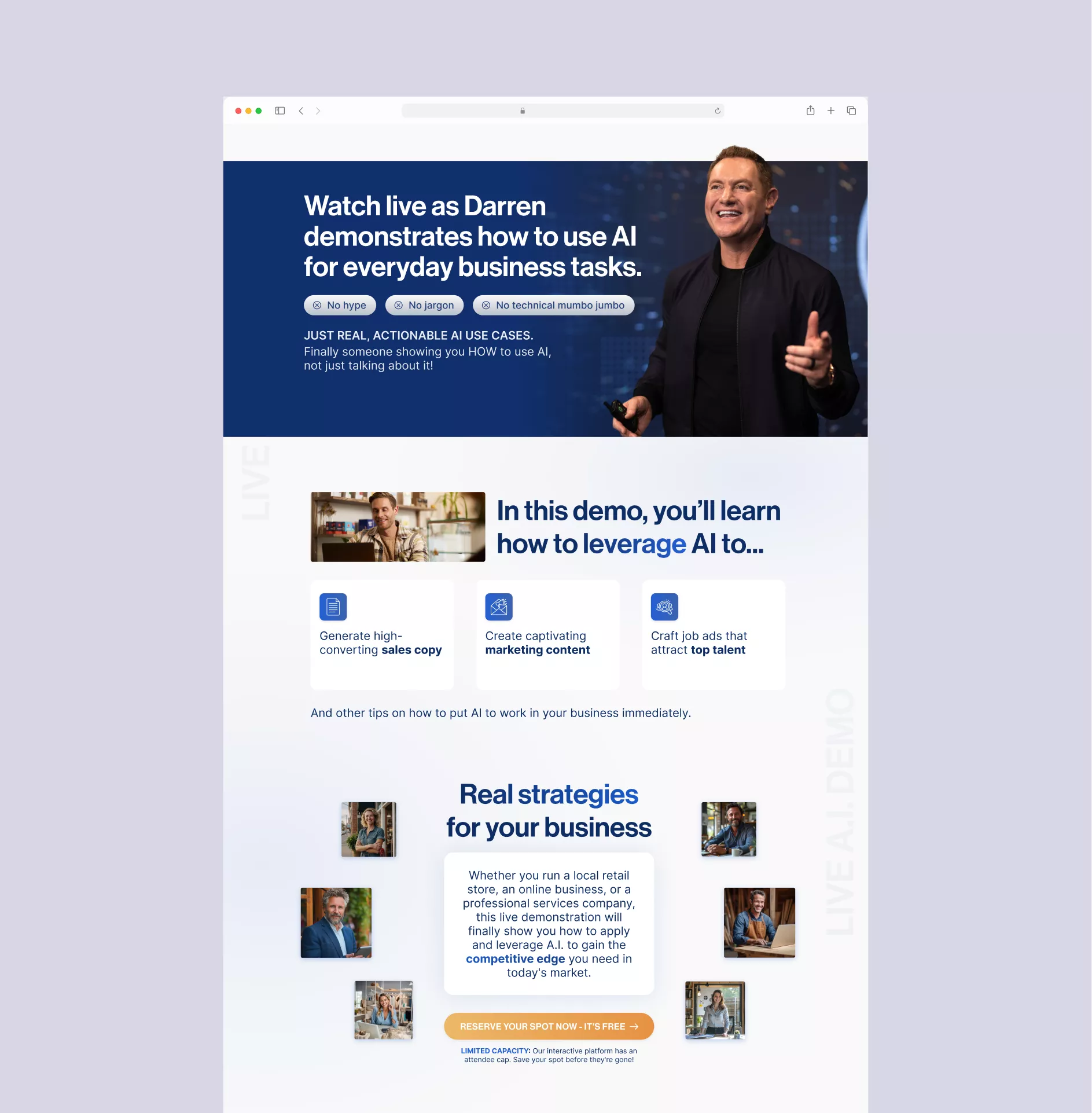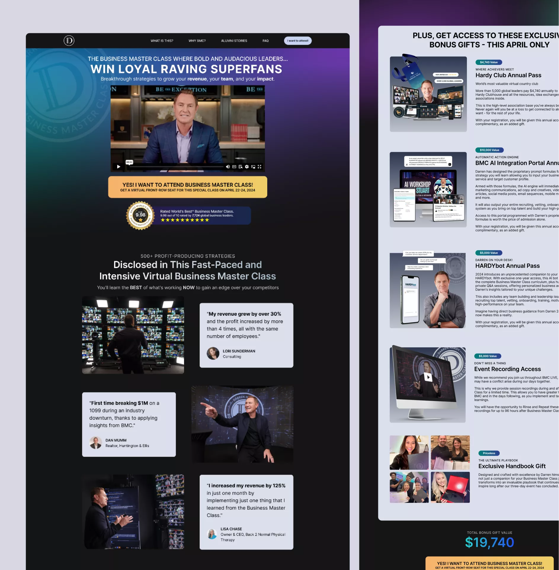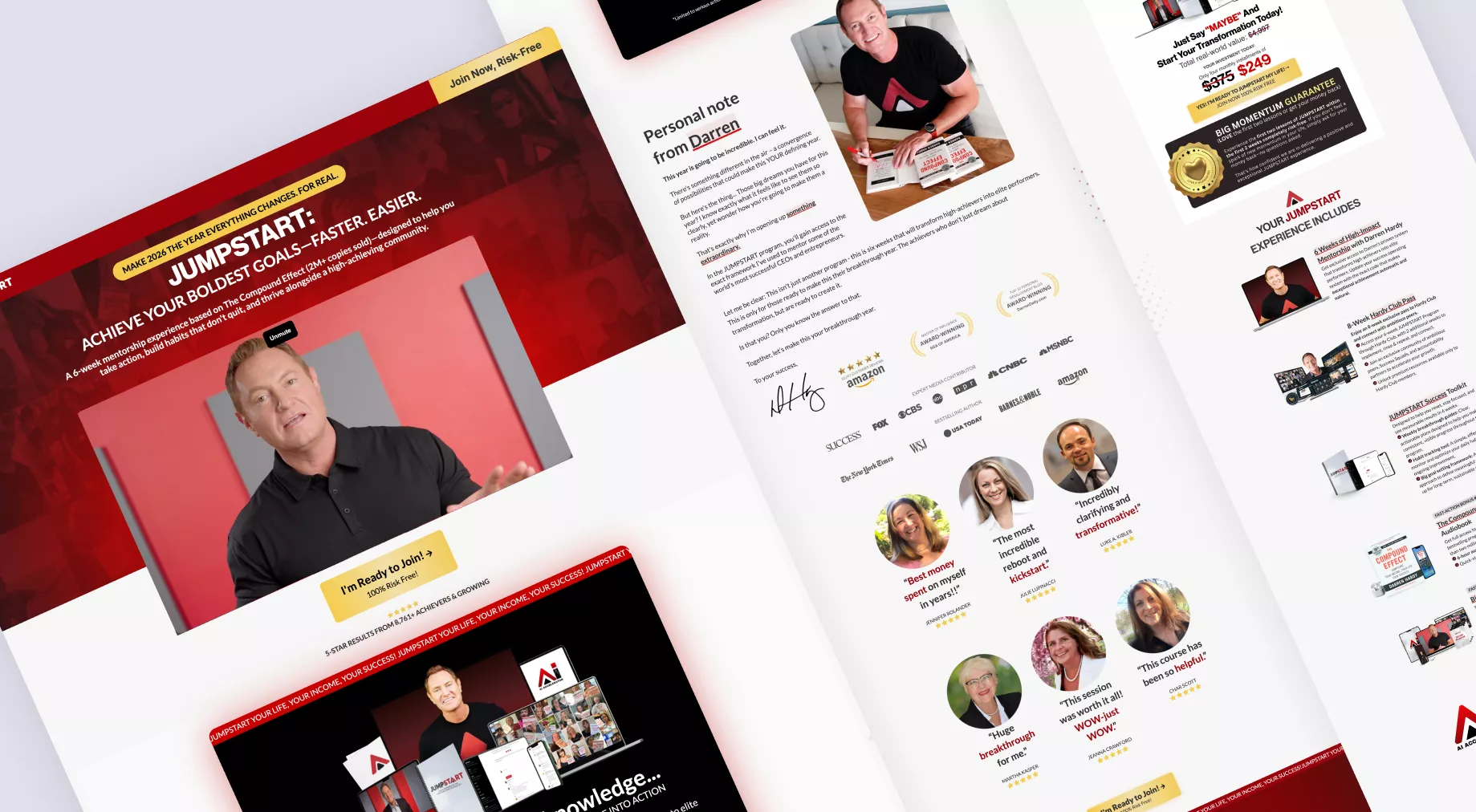 I worked with the Darren Hardy team as a contract designer, supporting funnel and landing page builds on a project-by-project basis. I collaborated primarily with the CMO and community manager and joined planning calls to stay aligned with upcoming campaigns.
