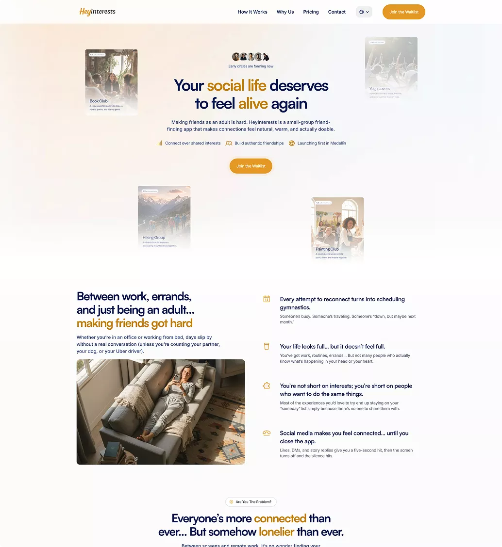 A previous client reached out with a landing page he had designed for a friend-making app he was launching. Although the design was amazing, the copy fell flat and the vibe was more 'saas' rather than 'let's be friends'.